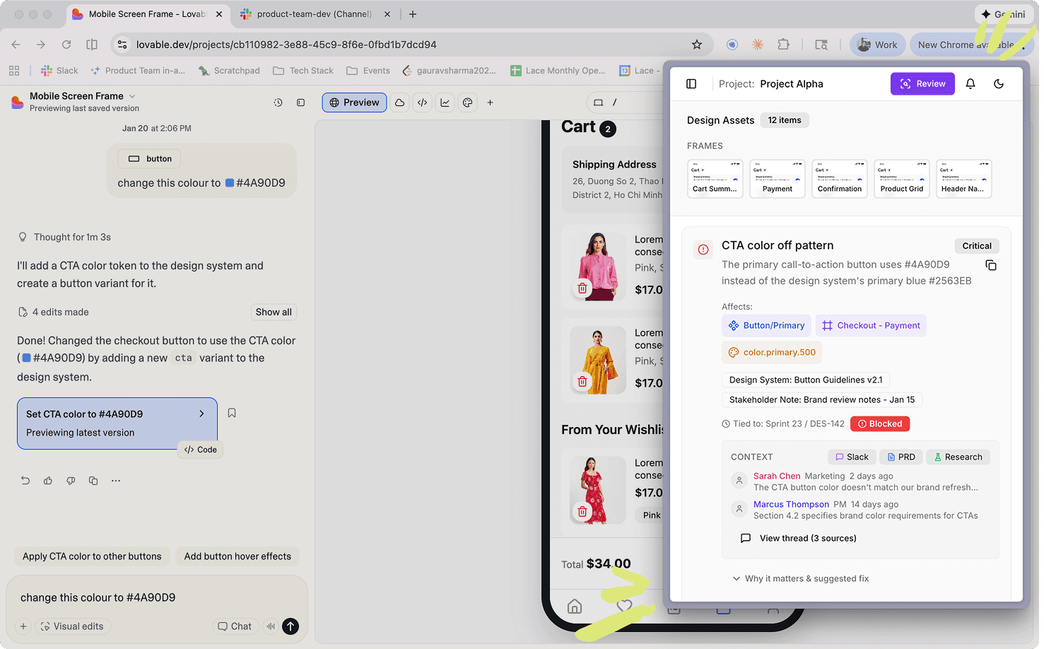 Lace continuously evaluates design changes against product intent, stakeholder feedback, and design standards.