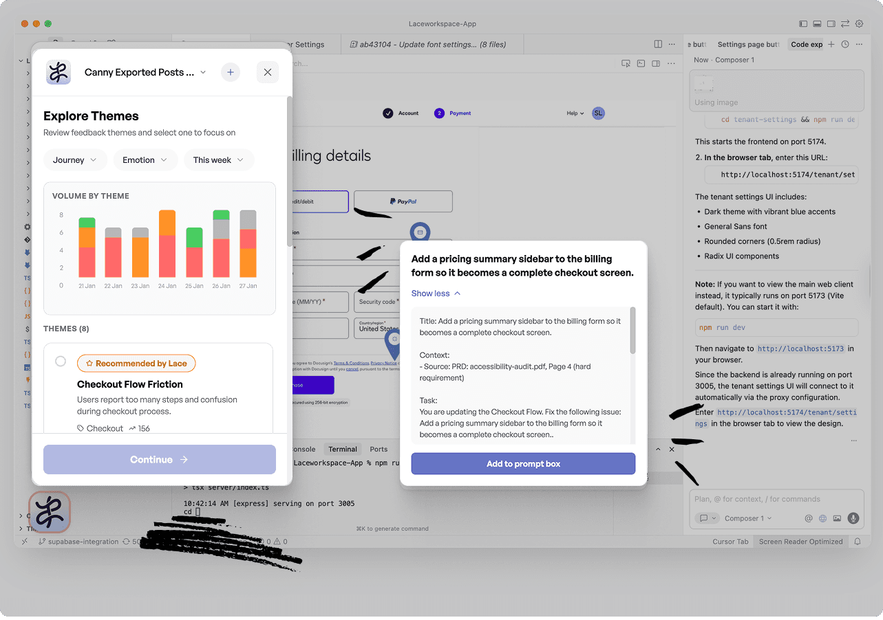 Lace continuously evaluates design changes against product intent, stakeholder feedback, and design standards.